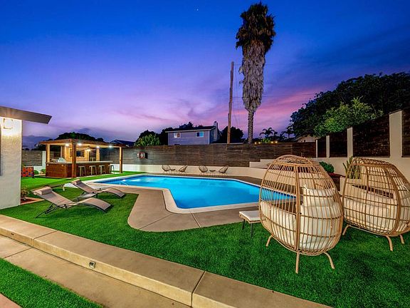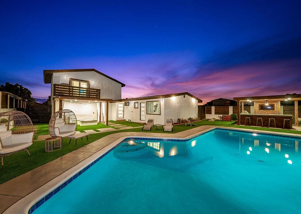Turnkey + fully renovated 3 bed, 3 bath modern home in the heart of Chula Vista! This beautifully redesigned property features a spacious open-concept floor plan, designer finishes throughout, natural lighting, and a resort-style backyard perfect for indoor–outdoor living. Step inside to a bright living space with large dual-pane windows, recessed lighting, custom accent walls, and luxury plank tile flooring. The chef’s kitchen offers new shaker cabinetry, a massive quartz island, stainless steel appliances, pot filler, wine fridge, and upgraded fixtures—ideal for entertaining. The main level includes two bedrooms and two full bathrooms, perfect for multigenerational living, guests, or a home office. The sleek bathrooms feature modern vanities, matte-black hardware, rainfall showers, and custom tile work. The private upstairs primary suite retreat includes a spacious bedroom, upgraded ensuite bath, and its own outdoor patio deck. Your backyard is an entertainer’s dream—complete with a sparkling pool, outdoor kitchen, built-in fire pit, built-in outdoor bbq/bar/fridge, low-maintenance turf, and privacy fencing. Additional upgrades include: new mini-split A/C units, updated electrical + plumbing systems, dual-pane windows, modern light fixtures, solar, and a two-car garage (opportunity for ADU garage conversion). Located near shopping, dining, schools, parks, freeway access, and the exciting Chula Vista Bayfront Redevelopment. Move-in ready, fully upgraded, and beautifully styled—this is Chula Vista living at its finest.