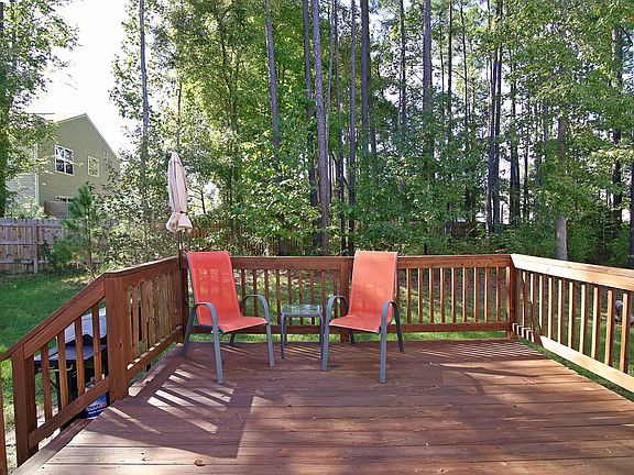 Beautifully maintained and move in ready. Freshly painted with living room fireplace, large exterior rear deck and private fenced back yard. Large 2-car garage with ample parking in cul-de-sac. Covered front porch. Access to community pool and conveniently located to shopping, restaurants, and commerce. Short drive to N. Raleigh, Durham or RTP. Large lounge area for privacy away from the bustle if necessary at top of stairs. Large walk in master closet. Tons of space.