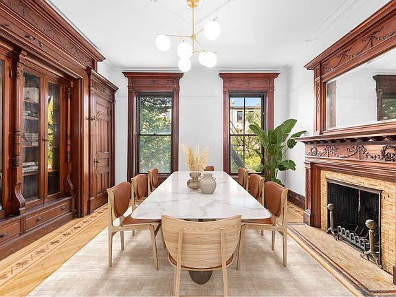 Built in 1894 by acclaimed architect Albert E. White, 1193 Bergen Street is an exceptionally preserved and beautifully renovated landmark home built in the Romanesque Revival style. Boasting museum quality architectural details, this four story townhouse offers approximately 3622 square feet, 4+ bedrooms, central AC/Heat, 3 full bathrooms, exceptional new chef's kitchen and beautifully appointed new baths. This stately home greets you with a gorgeous bayed fa ade of brick and limestone, tiled roof with dormer windows, and Juliet balcony. Inside, the historic grace blends seamlessly with a single family layout with a modern lifestyle in mind. The garden floor boasts a formal dining room which could easily accommodate a 16 seat table. It has a carved oak fireplace, wainsting and pocket doors opening into the large open-plan kitchen with huge island, 48 inch range, stainless steel appliances, and wide plank pine floors. A powder room and mudroom sit adjacent to the garden at the rear. There are French doors opening on to the gorgeous rear yard. This level also offers a perfectly located home office facing the yard. The grand double parlor will be the entertaining space of your dreams with soaring ceilings and original details including immaculate parquet floors, built-ins, pocket shutters, carved mantle, pier mirror, wainscoting, and moldings. The gorgeous staircase ascends one flight to the expansive master suite, featuring a full bath with antique honed marble, deep soaking tub and polished nickel fixtures, a master bedroom with walk-in closets anf built-ins, and a luxurious dressing room/guest bedroom/nursery or office with original woodwork. This floor has an additional two fire places. The fourth floor features three additional bedrooms (two with mantles), secondary bathroom, and Jack and Jill dressing room. The incredibly convenient A/C train at Nostrand is a four minute walk and only 11 minutes to the city with stops in Clinton Hill, Fort Greene, Downtown Brooklyn, and Brooklyn Heights/Dumbo. Easy access to the LIRR and also the 2/3 4/5 lines too. Nostrand ave is now teeming with old and new favorites like Blue Berry Farm Market, Breukelen Brasserie, Nostrand Pub, King Tai, Royal Bakery, India House, Sakura Tokyo and steps from BERG'N and co-working space giant, 1000 Dean Street. Booming restaurant row, Franklin Avenue is only 3 short blocks away. From your front door, stroll these coveted brownstone blocks over to Brower Park, the Brooklyn Children's Museum or the Brooklyn Museum.