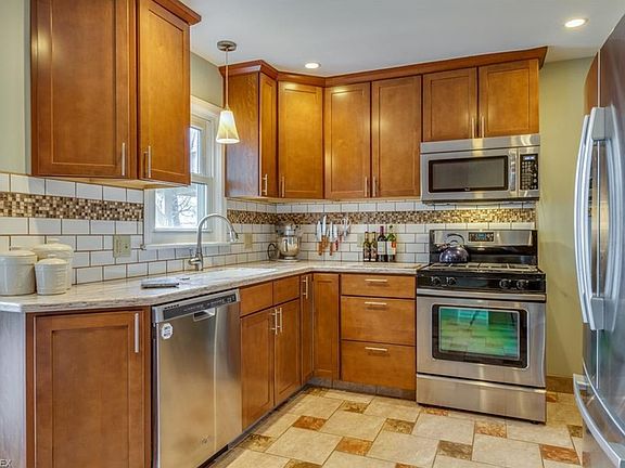 A gorgeous, completely remodeled kitchen and rear desired first floor family room highlights this wonderfully updated 3 bedroom colonial on a beautiful, quiet street. Front foyer entrance with guest closet steps into living room with beautiful wood flooring, wood burning fireplace and large bay window overlooking front yard. Formal dining room leads to newly carpeted family room addition with full windows, cathedral beamed ceiling and sliding door leading to back yard and side covered patio area. Kitchen offers brand new porcelain flooring, Corian countertops, generous pantry with pull out drawers, breakfast bar surrounded by custom cabinetry and shelving, recessed dimmable lighting and stainless steel appliances. Remodeled first floor half bath. Large sized bedrooms with owners bedroom and bedroom two both offering two closets each. Comfortable, walk up attic perfect for storage, is accessible through hallway on second floor. Full partially finished basement offers room under stairs for extra storage and separate laundry room with work bench, large sink, washer and dryer. Deep rear yard with covered patio is perfect for entertaining, play or relaxing! Furnace 1 year young! Newer chimney liner and Radon system. Attached garage with loads of shelving provides extra storage. Close to shopping and restaurants.
