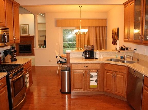 Super Nice Home in the Coves Subdivision! Light and bright open floor plan with Soaring ceilings and skylights. Upgraded all stainless steel appliance kitchen with custom 42" solid maple cabinets w/crown molding and solid surface counters. Great location, large patio, private yard w/tree lines & water views. Large loft may be converted to bedroom 3 or use as a nice Office space or kids play area. Vaulted master bedroom suite w/huge walk-in closet & nice soaker tub bath. Open foyer, see thru staircase, rare full basement with rough in bath awaits your finishing touches. Close to District 158 schools. Other key upgrades include recessed lighting, upgraded fixtures, tinted windows, 75 gallon water tank, and ceramic tiled showers. Home is in perfect condition!