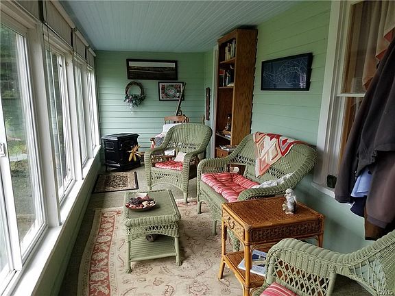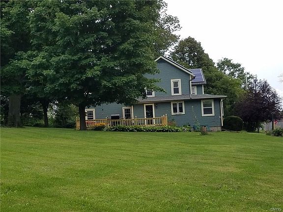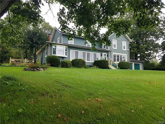 Miles of incredible countryside views! You'll love this scenic setting and you're just one mile from Skaneateles Marina boat launch! 3.25 acres and barns, vintage farmhouse renovated with 4 bedrooms and 4 baths. Second floor balcony overlooks backyard acreage. Main floor layout is versatile as Family room, slate floored with wood burning fireplace, can also be used for 1st floor ensuite master. Gorgeous yellow pine hardwood floors throughout. Large eat-in kitchen and quaint dining room both open to wonderful southern exposure sun porch warmed by gas stove, gracious living room and sizeable office, 1st floor laundry and mudroom. Oversized garage with workshop/storage area. Additional paved parking area and driveway to barn. Move in and make this your home for a lifetime! Previously operating as successful B&B (TripAdvisor 2015 Winner Certificate of Excellence) Solar Energy Savings (contract transfers)