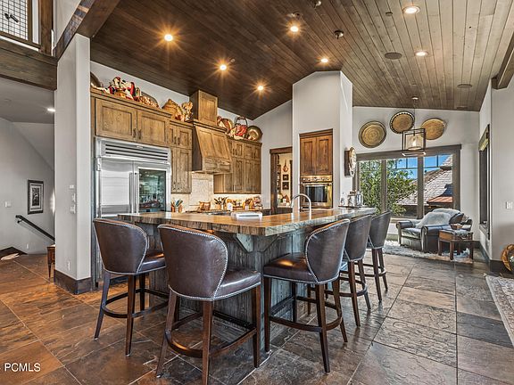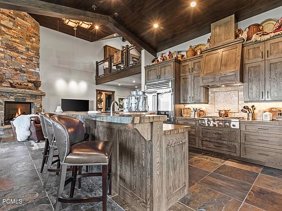 The main level showcases a floor-to-ceiling stone fireplace, a gourmet kitchen equipped with top-of-the-line Wolf/SubZero and Thermador appliances, leathered granite countertops, and white oak cabinets. A walk-in pantry adds functionality to the space. The primary suite offers a tranquil retreat with its own stone fireplace, a spacious walk-in closet, and sliding doors leading to the deck.