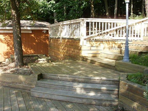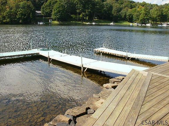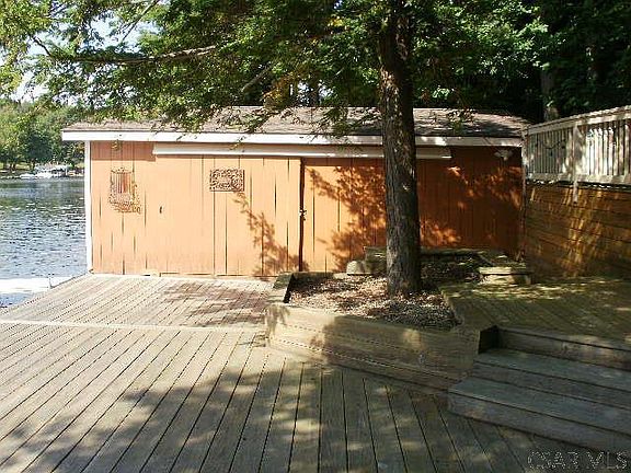 Lakefront property with 4 bedrooms and 3 full baths. Main level has oversized master suite, including a full bath, large open concept DR/LR complete with stone cased wood burning F/P, Laundry area, large walk out deck on lake side, upgraded kitchen with island. Upper level has 2 bedrooms, one with private balcony, and a full bath for guests to share. Lower level has a finished family room that walk outs to pathway to lake, another guest bedroom and full bath. Separate Utility Rm for storage. Paved pathway leads to the large deck area at the lake, 2 boat docks, and a boat house. 2 car detached garage for storing utility vehicles and boat.