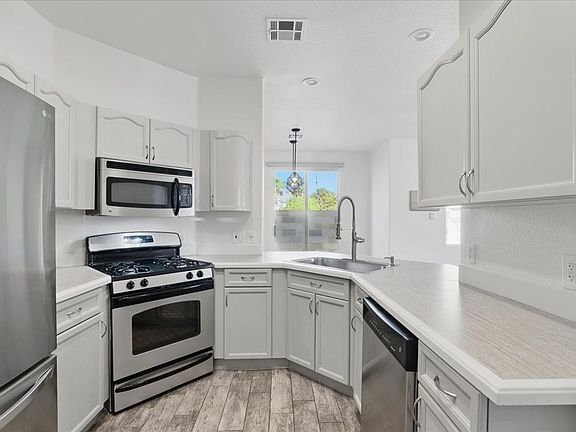 Fall in Love with This Immaculate Single-Story Dream Home in Silverado Ranch! This beautifully maintained home offers a rare layout featuring dual primary bedrooms and an open-concept design flooded with natural light. Relax by the elegant fireplace, or cook with ease in the stylish kitchen outfitted with GE stainless steel appliances. Easy-care wood-look tile flooring runs throughout. The spacious secondary bedroom boasts dual closets and a built-in desk area, while the primary suite features an en suite bath, mirrored double closets, and direct access to the backyardperfect for enjoying the hot tub. Step outside to your private oasis with stamped concrete, low-maintenance synthetic turf, and a charming gazeboideal for outdoor entertaining. The oversized 25' deep garage includes built-in storage cabinets and an accessible driveway trench plate, offering both convenience and functionality. Pride of ownership shines throughout*Close to shopping, the freeway and the Las Vegas STRIP