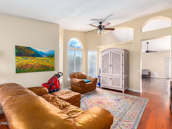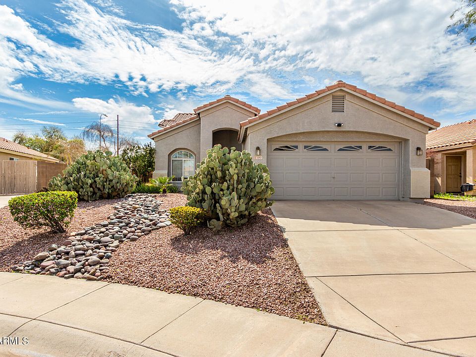 Beautiful 3BR 2B 2CG w/ desert landscaping and extra driveway parking. A covered front door entry leads into a welcoming formal dining and living room w/ vaulted ceilings and built-in plant shelves. A warm color palette runs throughout this lovely home with two-tone paint, wood look flooring, decorative fans and fixtures throughout. The kitchen features trending white cabinetry with decorative hardware, black appliances, gas stove, spacious breakfast bar and opens to the living and dining area. The main bedroom features pitched ceilings, a walk-in closet and a private bathroom with dual sinks, soaking tub and a walk-in shower. AC and water heater replaced 2023!! French doors lead to the backyard and a spacious paved patio area outlined by manicured gravel and easy maintenance landscaping. Amazing access to the valley, close to the 110, 202 and 101 Freeways. Minutes away from Downtown Chandler! Close to golf courses, dining, shopping and entertainment!