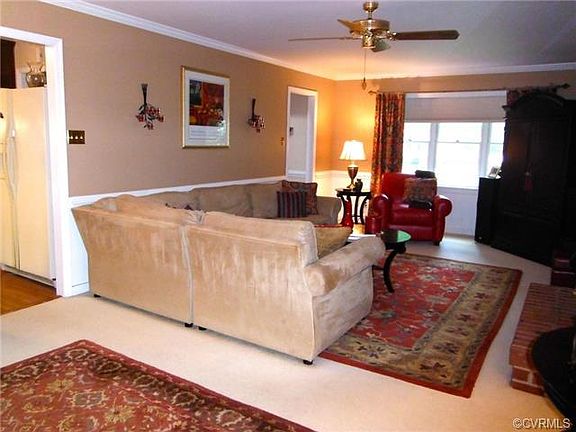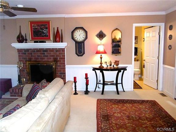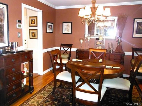 Charming 4 bedroom, 2.5 bath home on cul-de-sac lot, with paved drive and 1-car garage. Private tree lined, fenced in back yard with vaulted screened-in porch, and large deck with grilling patio. Huge Great room with brick fireplace, ceiling fan, french doors, and crown molding. Formal dining room with newly refinished hardwood floors, crown and chair moldings, and elegant chandelier. Eat-in kitchen features a bay window overlooking deck and mani cured back yard, lots of cabinet storage, pantry, and laminate wood floors. Skylights in both full baths and screened porch. TONS of storage: in garage, attached outdoor shed, and walk-up floored attic. Conveniently located to 288 and the Powhite Parkway.