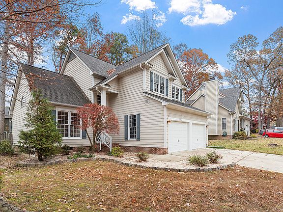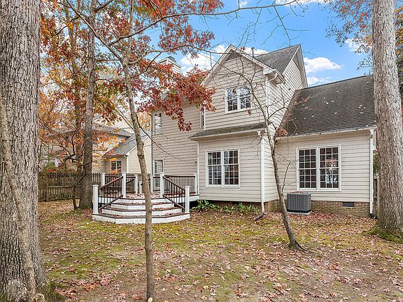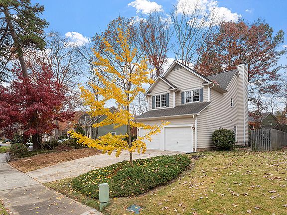Situated perfectly on the West side of desirable Harrington Grove, this home includes easy living inside and across all corners of the property. Traditional lines here surprise a bit on the inside, as the living area opens to vaulted ceilings and the stairwell to the second floor, then has great circulation to the kitchen. Kitchen connects to the family room with granite counters, modern tile floors, a fireplace and access to a deck with sturdy synthetic decking. Primary suite with additional vaulted ceiling, fun updates in the secondary bath with unique stone finishes, a fenced yard and beautiful front landscaping all here. And if that was not enough, it has a full two car garage. Proximal to Brier Creek, RDU, I540 and numerous amenities. It is ready for the New Year, all that is needed is you.