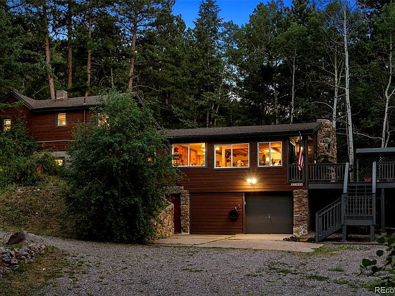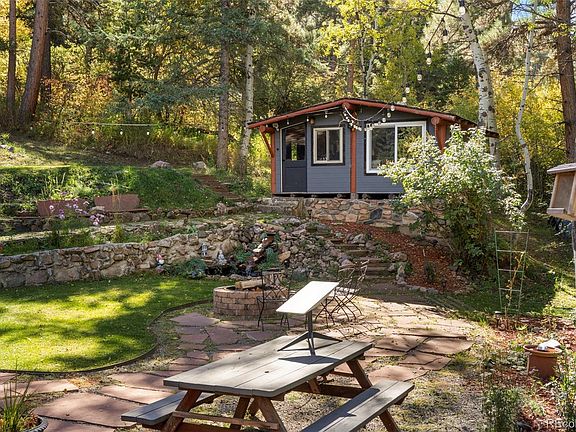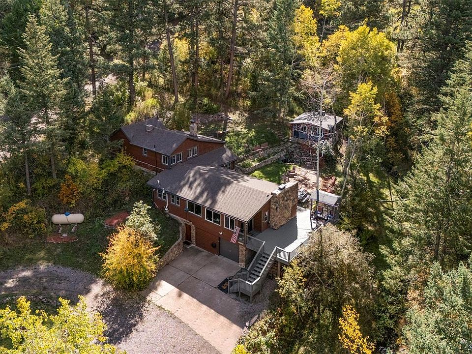 Quaint foothills charmer with exceptional character! Situated on 8 wooded acres and boasting a seasonal creek, this beautiful home has abundant natural light, a treehouse aesthetic, two fireplaces, and mountain vibes. The serene outdoor space includes a deck, patio, water feature, and a small cabin - perfect for an art or music studio, kids playroom, home office, or even a small rental! Updated throughout, including newer Kitchen-Aide appliances and a luxurious primary bathroom. Prewired for a generator, updated chimney caps, enhanced sump-pit and pump, new gas lines, exterior lighting and camera system round out the mechanical features. Easy access to the city - just 20 minutes to town, close to both Lockheed Martin facilities, Ravenna Golf Club, C-470, the 285 corridor & National Forest Access, Deer Creek Canyon Park, South Valley Park, and all amenities.