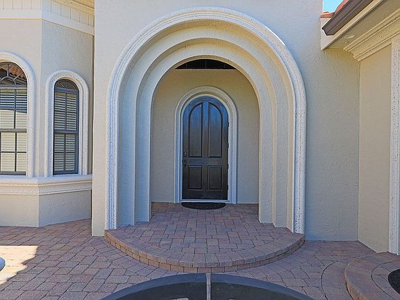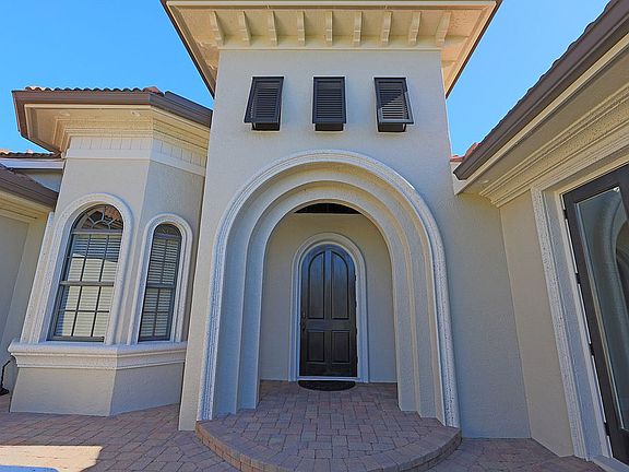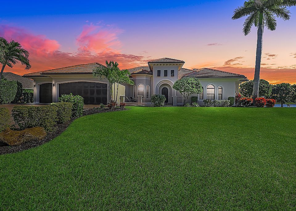 Gorgeous golf and water views! This 3 bedroom, home office/den, 3 full baths and oversized 3 car garage custom home located in Cape Royal community features a lanai with a pool/spa and extra patio area with fireplace for fantastic golf view of Prince #6. Volume and tray ceilings, 8' interior doors, tile floors, gourmet kitchen. Master Suite with two walk-in closets, luxury bathroom retreat featuring garden tub, dual vanities, walk in shower, etc. Tile floors, crown moldings, wood cabinets, IMPACT glass, 2 AC units for comfort throughout the home. Please call for a showing.