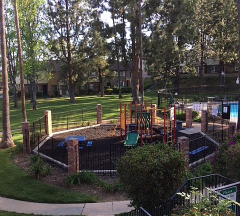 Children's playground surrounded by beautifully maintained landscaping