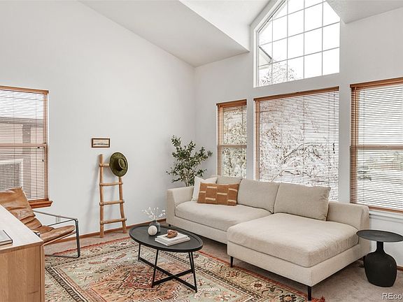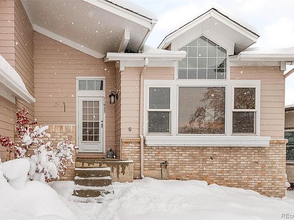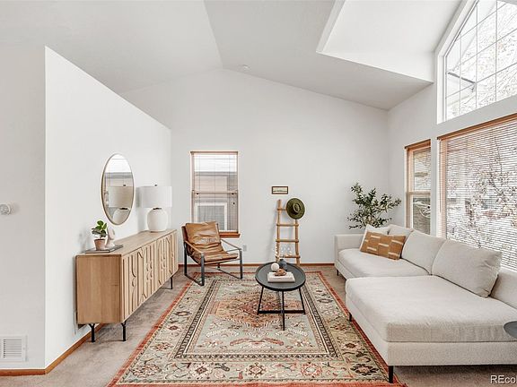 Abundant natural light fills this inviting Shadow Ridge home. Newer windows on the north side inspire a bright and airy atmosphere complemented by a light, neutral color palette. Enjoy relaxing and entertaining in a spacious living room featuring vaulted ceilings. Crowned by a contemporary light fixture, a dining area extends into the kitchen offering granite countertops and a sizable pantry. Sliding glass doors open to a deck overlooking a large, fenced-in backyard with mature landscaping and irrigation. A cozy fireplace warms a secondary living area with patio access. One of three upper-level bedrooms, the primary suite boasts mountain views and a walk-in closet. A laundry area with a washer and dryer set is an added convenience. Downstairs, the lower level hosts a fourth bedroom and flex space. Additional upgrades include new A/C, a whole-house fan, a radon mitigation system and an extended garage with a south-facing driveway. In the summer, enjoy a fruit producing pear tree, strawberry plants, and an irrigated garden bed in the backyard. A central location provides proximity to schools (elementary and middle school are across the street, and high school is less than a mile away), shopping and C-470.