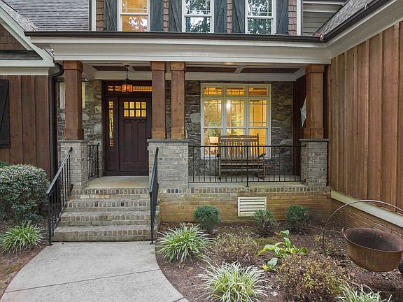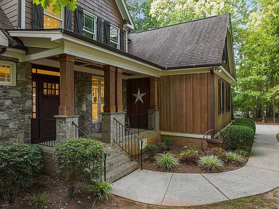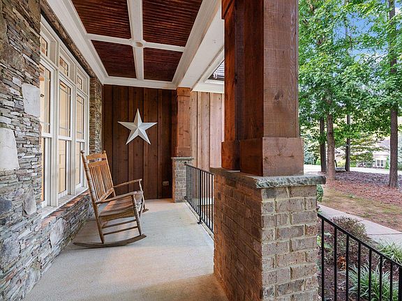New Interior Paint. Charming Custom Craftsman with four bedrooms and three full bathrooms. Master and guest room with adjacent bathroom on the main level and two spacious secondary bedrooms on the upper level. Two bonus rooms give lots of space to entertain, play or hang out in comfort. Use one as a media room and the other as a giant office, craft room, playroom or whatever you can imagine. The fenced flat backyard, screened porch, rocking chair front porch & large play structure will encourage everyone to the amazing North Carolina weather. Upscale features include: site finished oak hardwood floors, mahogany front door, dining room w/ coffered ceiling, stacked stone fireplace, unique granite counter tops, & soaring ceilings. Other features include: oversized two car garage with heavy duty above car shelving, huge master closet & rustic barn doors adorn the pantry & master bathroom. Bonus room #1 has new carpet, bonus #2 is plumbed to add a wet bar or a kitchenette. Community pool & playground. Refrigerator & basketball goal convey.