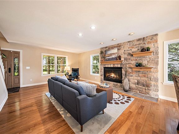 Pleasant Lake home with beautiful views of the lake. Interior of the house is situated where most of the rooms from inside have a view of the lake. Main level has a living area with a fireplace, kitchen with an eating area that has a gorgeous view of the lake and opens to a large deck to relax or entertain on, there is a nice size guest room on the main level along with a laundry room, full bath and mudroom. 2 of the 3 bedrooms upstairs look out to lake. Walkout Basement is finished with a half bath, large entertainment area that opens to a large patio, extra room in the basement could easily be made into a bedroom by adding an egress window. Enjoy this all sports lake with over 170 ft of lake frontage. Great location, lake living with only a 20 min drive to UofM stadium.