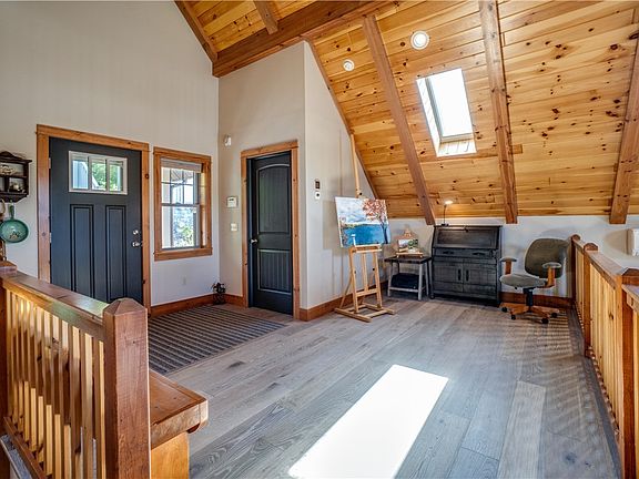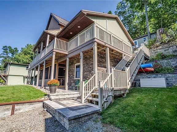 Keuka Lake! This lower east lake road home was built in 2016 with high end local contractor and is situated ON the water with elevated designed and very comfortable layout. As you enter in to the spacious loft area, you'll love the wood vaulted wood ceilings and sky lights. Truly feeling "on the lake" throughout the home, the main living level has 2 bedrooms; one primary suite with walk in closet, private bath, and deck access. The second bedroom also has it's own deck access close to another full bath and laundry area. This main level centers around the focal gas fireplace, open to dining area in to custom kitchen with large island seating all situated to the water. Downstairs on the lowest level and just off of the water are another 2 bonus rooms, second kitchen, full bathroom. Walk out to beach through large screened porch with incredible additional living space. A mix of shale beach, grassy yard and permanent dock with sitting area. Convenient tram brings anything you need down to the water. Two garages, one on water, one on included secondary tax parcel across East Lake Road for additional parking and expansion potential! Delayed negotiations October 3 at 12pm.