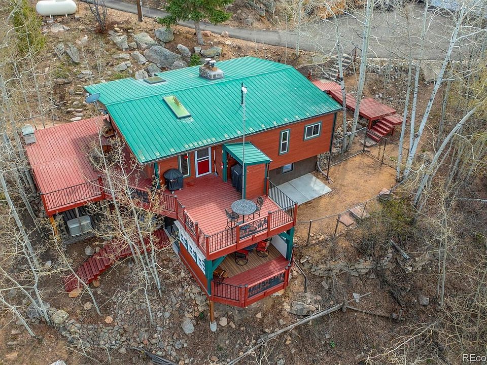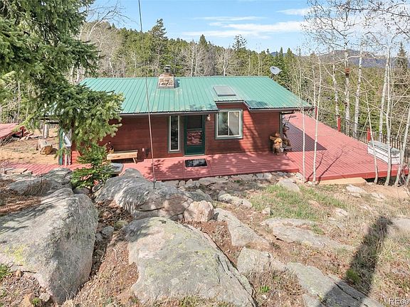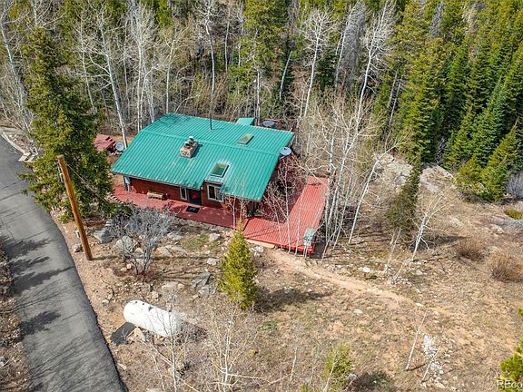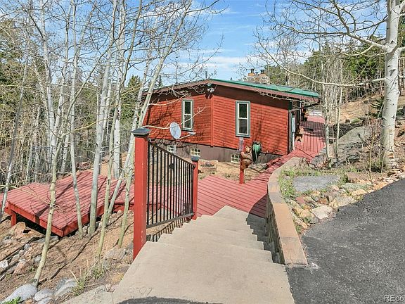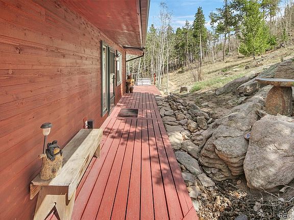 Come enjoy the SERENITY OF MOUNTAIN LIVING in this IMMACULATE, 3 Bedroom, 2 bath ranch home. From the moment you walk in, your breath will be taken away by the majestic views from the large picture windows on the main level. The family room is open, with beautiful Hickory LVT flooring along with wood beam ceilings, new skylights, rock surround wood burning stove, and gorgeous views. The open concept kitchen has coriain counters, large island with breakfast bar, hickory cabinets, SS appliances and eat in area. Walk outside to one of your 3 decks to enjoy the mountain air. Larger deck has an electric, remote controlled, expanding awning. The 2 bedrooms on the main level are roomy, with beamed ceilings and are close to the full bathroom. Venture to the basement for a cozy bonus room, with another wood burning stove, dry bar area that walks out to a covered deck. The primary bedroom is large, with an ensuite bathroom that features a large tiled shower. Dedicated laundry room with cabinets for storage. Newer windows throughout. The oversized, 3+ car garage has room for your RV, along with a lift. Set up your workshop and office with plenty of storage space in the loft. Plenty of parking in your oversized, asphalt driveway. Enjoy walks through the 3.4 acres of your beautiful aspen treed lot(s) and trickling creek. Pick a deck to watch and enjoy the hummingbirds, foxes, and deer. County maintained school bus route road-priority plowing on snowy days. Be sure to check out the attached video for a breath taking tour. Schedule your showing today to see for yourself how beautiful this home is. Less than 25 min to Golden and 30 min to Boulder, in beautiful Coal Creek Canyon.