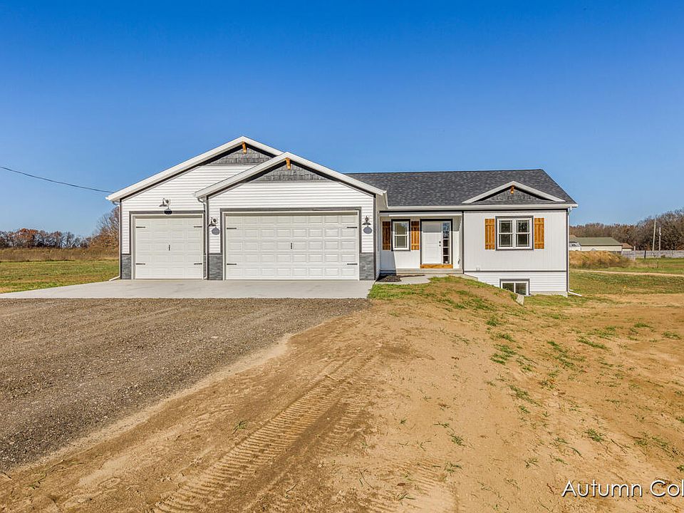 Welcome to your dream home! This stunning, brand-new custom-built residence offers elegance, comfort, and thoughtful design on just over 2 acres of serene landscape. Boasting 5 spacious bedrooms, 3 full baths, and a fully finished basement, this home is perfect for both relaxing and entertaining. Upon entering, you'll be greeted by soaring vaulted ceilings and exquisite woodwork. The open-concept kitchen features hard surface counters, a large island, a walk-in pantry, and beautiful finishes that make it a chef's dream. The main level includes a luxurious primary suite with a walk-in shower and a dedicated laundry room for convenience. Downstairs, the fully finished basement provides a versatile space complete with an additional office, ideal for a private workspace or a quiet retreat.