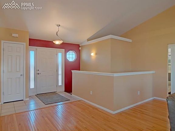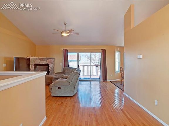 This 4 bed, 3 bath home sits on an acre lot w/ stunning Pikes Peak views. Tons of natural light fill the home through the new, energy efficient windows. The living room has cathedral ceilings, gas fireplace & walk out to back yard. The dining nook has wood floors & a bay window for added space. The galley style kitchen has new SS Frigidaire Appliances, pantry, breakfast bar & tons of cabinets/counter space. Master Suite features inc: French Door entry, wood floors, vaulted ceilings & attached 5-piece bath w/walk-in closet. The Laundry, 2 additional bedrooms and a full bath complete the main level. The basement has a massive family/recreation room, a spacious 4th bedroom and a full bath. Also, there is a unique and versatile room the kids are affectionately calling a "Harry Potter Room". This room is at the bottom of the stairs. It is currently being used for storage; however, this room was previously used as a smaller bedroom. It could easily be an office, craft room or game room. There is some storage in the unfinished mechanical room and a finished storage room near the 4th bedroom. The level, acre lot with gated access from either side of the house has a gazebo wired for a hot tub and lighting. There is a patio waiting for your lawn chairs and fire pit. Plenty of space to add a separate detached garage for your Recreation Vehicles/Toys. Conveniently located off Woodmen Hills Drive and Meridian, there is easy access to parks, schools, shopping, Peterson AFB, Schriever AFB and the Academy.