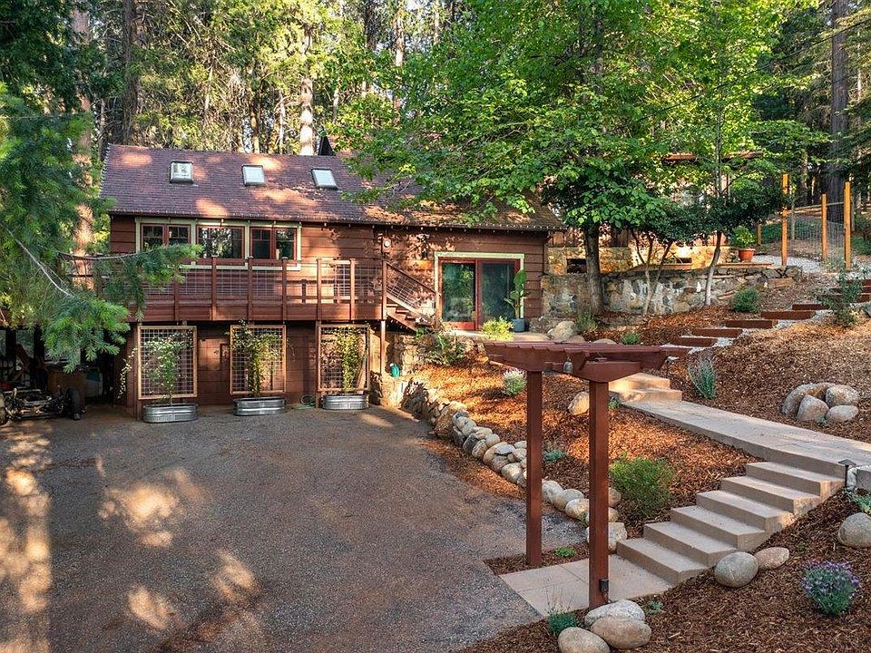 Enchanting, Artisan/Craftsman home that has been lovingly restored with attention to quality and detail. Tucked away on a private drive that bridges the NID canal, you will be intrigued beautiful home in the woods. Real redwood siding and beautiful stone masonry blend nicely with new custom red metal and wood dual pane windows. Open and spacious living room flows into spacious dining/kitchen area. A Vermont casting wood stove gives added ambiance for cozy winter nights. This home exudes warmth, charm & character. Living, dining, family area opens to a deck where sounds of the canal and nature abound. Lots of natural light with numerous skylights & a custom stained glass window add to the magic. Up the few stairs you will find three large bedrooms and a laundryroom. Extra large master bedroom can easily be made into 2 separate bedrooms. Lower level offers workshop and storage. There is an enclosed carport wired with 220.Backup Generac Generator. Steps away from the Cascade Canal. Centrally located.