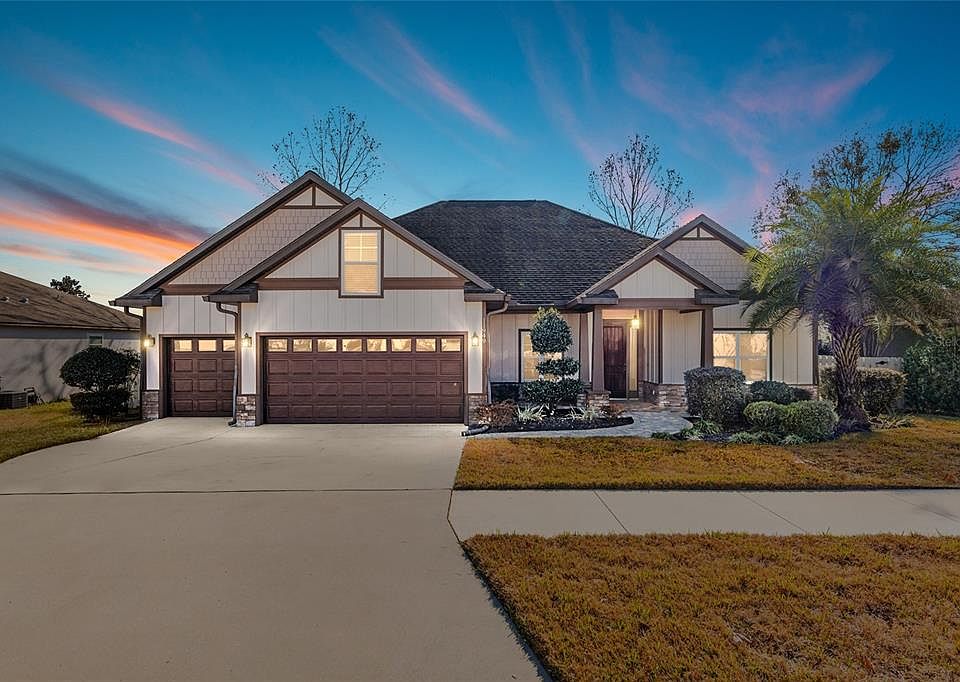 One or more photo(s) has been virtually staged. This one has it all! Built in 2015 as the builder's Parade of Homes model and it shows! Located in the South Pointe community, this Craftsman style stunner features 4 bedrooms, 3 full baths in a well-designed floor-plan that spans 2,428 sqft. Beautiful landscaping welcomes you home as you enter through the oversized front porch that's adorned with brick pavers, wood beams, stone and 8' entry door. The immaculate interior features warm hardwood floors, 10' ceilings and crown molding. The open layout showcases the living space, dining, kitchen and breakfast nook with tons of natural light. You'll love the split-plan with master and ensuite bath downstairs along with two additional guest rooms with full bath. Upstairs you have a guest suite with full bath. The large kitchen is adorned with custom wood cabinetry, travertine tile backsplash, stainless appliances, granite counters, custom pantry door, pot filler AND built-in wine fridge! Enjoy sipping your coffee or dining al fresco on your screened lanai overlooking the brick paver fire-pit. Plenty of room in the yard still for a garden, play set or back your boat in and store it behind the privacy fenced yard. The THREE-car garage with epoxy floors also has plenty of room for extra storage. Community amenities include a pool and playground. Perfectly situated between I-75/Gainesville and Town of Tioga/Jonesville area with grocery, shopping and dining all nearby. Currently zoned for Hidden Oak, Ft Clarke and Bucholz.