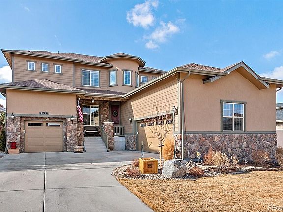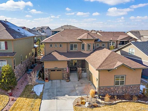 A mountain modern Toll Brothers home in the coveted Idyllwilde/Legend High School and Cimarron Middle School neighborhood! Walk to school, Fika coffee house and the pool or rec center, and enjoy easy access to downtown Parker and major city essentials while being tucked away in the heart of Parker. An open concept two story home with vaulted great room flooded with natural light and an expansive floor-to-ceiling fireplace, side private coffee or wine deck, gorgeous hardwood flooring and a pristine kitchen with eat in space and lovely outdoor entertaining spaces with the custom-made pergolas. The spacious Owner's suite features envious downtown views, five piece bath with soaking tub and expansive shower provide the perfect haven. Work or school from home in the main floor dedicated office with French Doors. The upstairs secondary bedrooms include a jack-n-jill bathroom with private sinks and walk in closets. This home provides room to grow with a spacious finished basement with a media room bedroom and 3/4 bathroom. Outdoor entertainer's dreams abound with multiple pergolas with built-in BBQ/kitchen, extended decking, covered patios with outdoor speakers, yard to play and a custom natural gas fire pit. Upgrades throughout include lighting, speakers, 3 garage with over-sized garage doors, and more. This home is turn-key, meticulously maintained and won't last long!