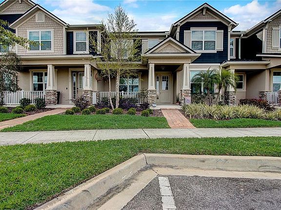 Windermere Trails Townhouse! Luxurious and sunlit, this 3 bedroom, 2.5 bath property shines with a contemporary design that keeps the living areas bright with light wall colors and neutral floor tiles/carpeting. Downstairs, you'll find all the common areas including living room and kitchen/dining room combo with eat-in kitchen island, stone counter tops, custom backsplash, premium cabinetry featuring under cabinet lighting, and kitchen appliance package. Upstairs, the bedrooms are organized in a split-bedroom arrangment with the convenience of an unstairs laundry room for easy access. This overall layout provides boundaries between personal space and areas for gathering/entertaining. A rear courtyard extends the living space to the outdoors offering relaxation under the sun and the stars, and a covered pathway leads to a private 2-car garage. Windermere Trails is a highly desirable community with included amenities: pool, splash park, open air pavilion/cabana, playground, exercise area, wide jogging/walking/bike paths and dog park with wash station. Its unparalleled location offers easy access to tourist attractions and major roadways. Top-rated schools are nearby with Bay Lake Elementary School right across the street. Convenient and low-maintenance living at its finest. Schedule a tour today!