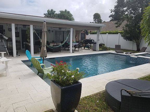 Highly sought after Garden Woods subdivision, NO HOA! Total remodeled home (2017) with beautiful granite countertops, 3 years old cabinets, stainless steel appliances and washer dryer. Knockdown texture ceilings with hi-hat lights. Beautiful fireplace! Kitchen opens up to family room. 3 large bedrooms, all with walk in closets. 3 full bathrooms! All remodeled with beautiful porcelain tile. Both the master bath and the guest bath have dual sinks, with custom cabinet and granite tops. Laminate flooring throughout, except for Kitchen areas and bathrooms, which are porcelain. Large patio, with a door leading to the 2nd guest bathroom. Sliders lead into the dining room, as well as, the master bedroom. Corner lot with large yard. Roof replaced in 2000. Inground pool and Jacuzzi with heater by Jandy and travertine deck, make an spectacular back yard enclosed by pvc white fence for absolute privacy. Hurricane shutters all around. Beautifully landscaped and newer A/c(2017). Won't last at this LOCATION. More pictures coming.
