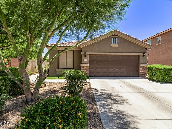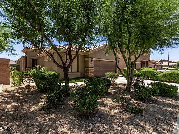 Inside, the move-in-ready home features this 3-bedroom, 2-bath 1869 sq ft of living space, espresso-stained kitchen cabinets, stainless still appliances, granite countertops, a kitchen island, and a bar top. The master suite boasts dual sinks and a walk-in closet. You'll love the inviting great room and additional office space. 2-car garage, stone accents, manicured landscape, backyard featuring a covered patio pergola, artificial turf, mist system.