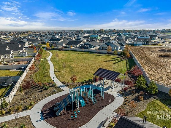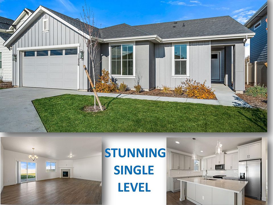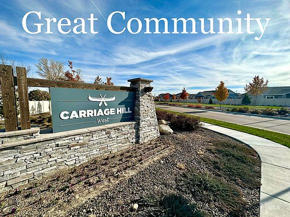 Stunning single level, better than new in the coveted Carriage Hill West Community. Close to Lake Lowell, shopping, community pool/park, Midway & Mallard Parks & coming soon, Huckleberry dog park. Fully fenced & landscaped on private set back lot w/no rear neighbors & NE Mountain Views! "Collins" plan built by Toll Bros features; split plan w/9' ceilings throughout, huge covered patio, textured & painted garage w/man door, full wood wrapped window trim & blinds, gas fireplace, elegant interior shaker style doors, covered entry, full gutters, chrome hardware & fixtures, H2O Softener, extensive vinyl plank flooring throughout all the main living areas, mud rm, expansive windows & more. Huge Kitchen w/tons of cabinet & quartz counter space, full tile backsplash, SS Whirlpool appliances, gas range, drop pendant lighting over island, pantry & SS Fridge included! Master overlooks private rear yard & features Master bath w/floor to ceiling tile shower, his/her sinks, tile flooring, raised vanity & private commode.