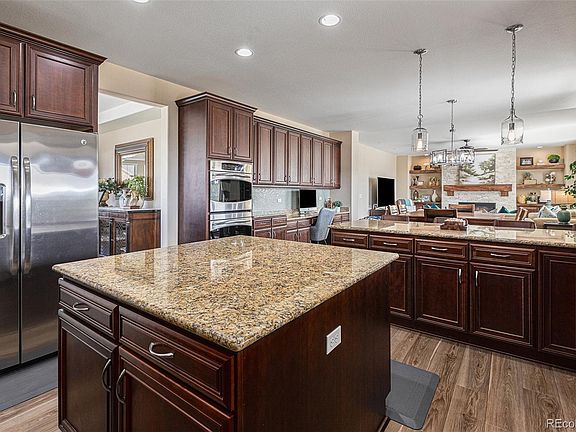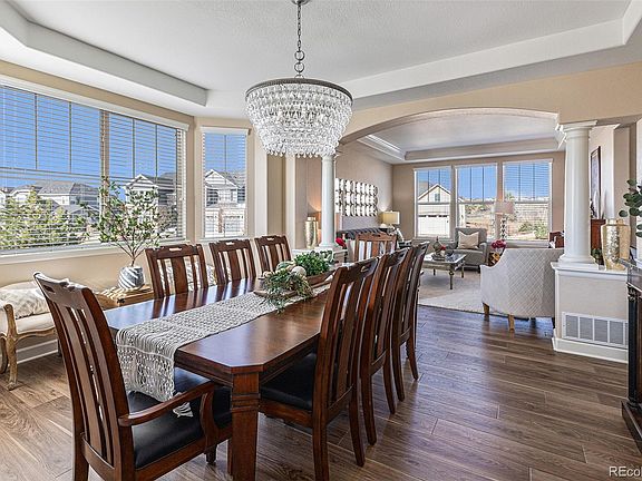 Enjoy living in Parker's coveted Hills at Idyllwilde, walking distance to some of the best trails, parks, schools, community pool & clubhouse, Black Bear Golf course, Downtown Parker, and Parker's popular Fika Coffee House at Idyllilde. This spacious Colorado Style home features 6 beds, 5 baths, 1 office, formal dining, a well finished garden-level basement, 3 cozy fireplaces, large 3-car garage, a large pro-landscaped backyard with gas firepit, plenty of useable outdoor space, all sitting on almost a 1/2 acre lot. Enjoy vaulted ceilings in the formal foyer when you enter this home. A gourmet inspired kitchen features double ovens, gas cooktop, plenty of cabinet & counter space and flows into both dining rooms. Relax or Entertain in the family room with a custom stone fireplace surrounded with wood built-ins. Working from home is a breeze with your main floor office with custom built in bookcases. This fully finished garden level basement offers an abundance of natural light throughout that allows you to comfortably entertain day or night with the large living room and game room as well as 2 bedrooms and a bathroom plus storage. Wide -open staircases allow your living spaces to flow together from one floor to the next. Escape into the Primary retreat which features a spacious bedroom with a see-through fireplace into your private sitting area. The Primary 5-piece ensuite also attaches to your extra-sized walk in closet. Hurry & See today as homes in this neighborhood do not last long!