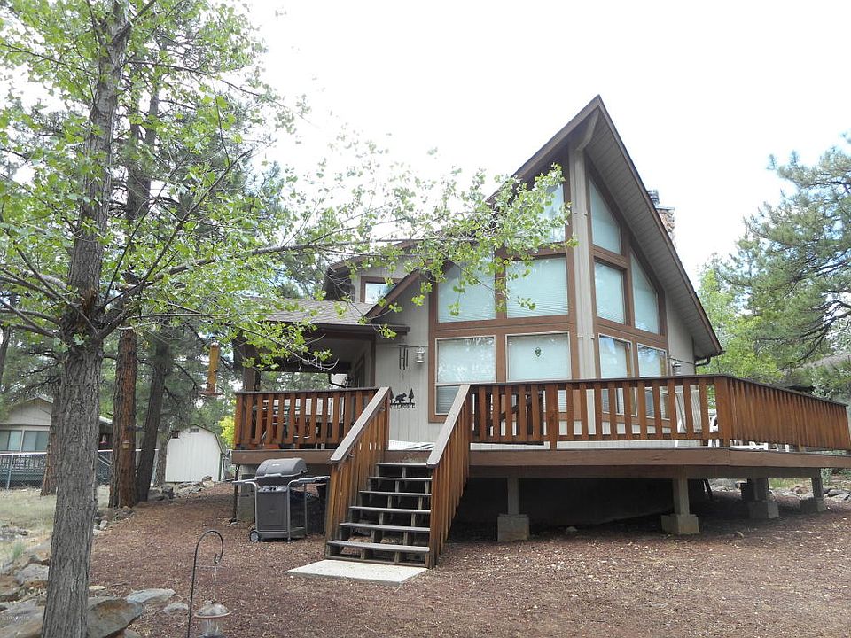 This home shows like it's new!!Many extras like hickory cabinets, soaring vaulted T&G ceilings, fireplace, AIR CONDITIONING< prow front windows for a terrific view to Munds Canyon. Trex decking for low maintenance and great covered deck. Fenced back yard and the shed is large enough for 4 of your motorized toys.