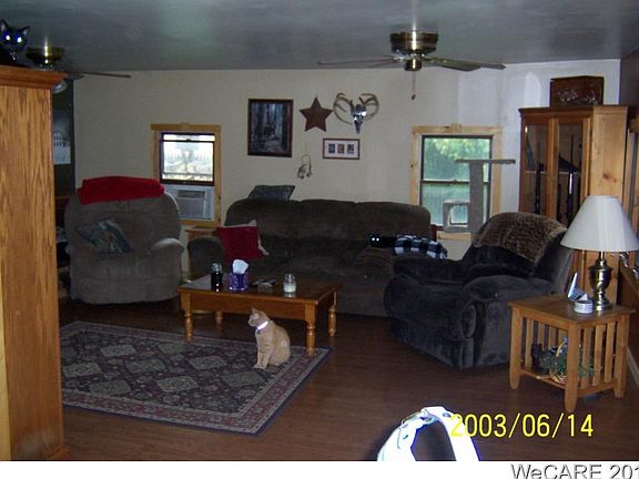 4BR 2 bath ranch home on a large lot. Updates include laminate flooring and drywall in living room, dining room and kitchen. Wall to wall carpet in rear hallway and entrance. Tile flooring, vanity and toilet in master bathroom, new exterior electric panel, water softener, wood stove. 2 car plus garage. Kitchen stove, refrigerator and dishwasher included in sale. Manufactured home Champion 1968.