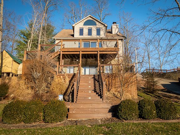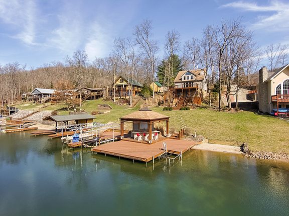 Beautiful Grandview Lake just in time for summer! Delightfully updated lakefront home nestled in a cove. Entering this home, you will be greeted by a wall of windows overlooking the water. 2-story great room features a stone fireplace& barn-wood ceiling. Kitchen features SS appliances, custom cabinets, granite & island. Primary bed & bath privately located on upper level. Enjoy card games and conversations on the multi-level deck taking in the water views. Walk down to the dock & soak up sun or hang out at the spectacular dockside bar featuring red wood cedar, stone countertops and copper accents. Yes, that is a bathroom dockside, a rarity at this lake! Enjoy the water right from the dock or swimming from your very own beach!
