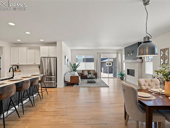 Explore the inviting Farm community, where modern living meets natural charm. Step into this delightful Vantage Home for an exclusive tour that introduces you to a comfortable and connected lifestyle. Set near the esteemed USAFA, the Farm community offers 25 acres of parks, serene ponds, and a sprawling 135-acre nature preserve for outdoor enthusiasts. This home embodies a contemporary spirit, from the functional kitchen with stainless-steel appliances and white quartz countertops, to the large living room featuring a gas fireplace. Experience the Mountain Views from inside and out with the landscaped outdoor space that is perfect for gatherings. On the main floor you will find a relaxed primary re-treat and a versatile secondary bedroom or office space. Downstairs, discover ample space for various activities, along with three spacious bedrooms. Enjoy convenient access to shopping, dining, and major routes, as well as the community's recreational amenities like kayaking, fishing, gym space, and a seasonal pool, making the Farm community a genuinely exceptional place to live.