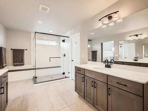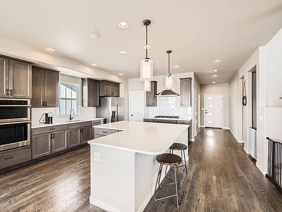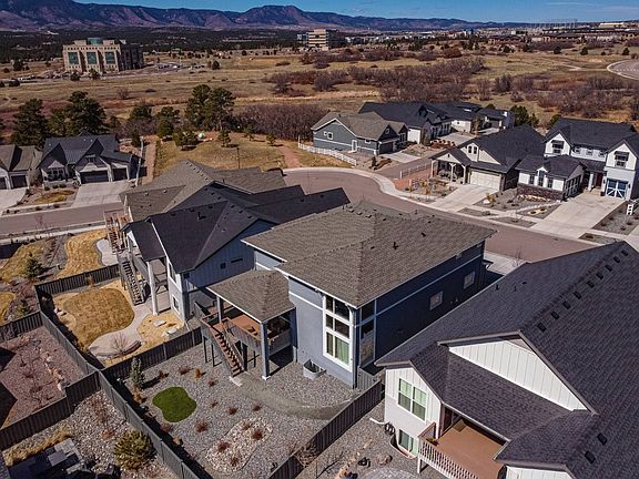 Discover this stunning, nearly new home in the prestigious Farm neighborhood, offering breathtaking views from the covered back deck-perfect for enjoying the weekly Air Force Academy flybys. Located in the highly acclaimed Academy School District 20, this home blends luxury, comfort, and convenience. Step inside to find stylish, on-trend finishes, including rich wood flooring that flows throughout the open-concept living spaces. The expansive kitchen is a chef's dream, featuring sparkling quartz countertops, state-of-the-art appliances, a massive walk-in pantry, and an oversized breakfast bar with ample seating-all overlooking a soaring great room anchored by a cozy gas fireplace. Enjoy seamless indoor-outdoor living with a walkout to the covered back deck, where you can take in the serene views while entertaining. A versatile main-level flex room serves as a formal dining area or a private home office. Upstairs, all four spacious bedrooms boast stunning views. The primary suite is a true retreat, featuring a spa-like walk-in shower and generous closet space. The finished basement is perfect for guests or extended family, complete with an elegant bar/kitchenette, a large bedroom and bath, and a bonus room ideal for a home gym. Nestled in a quiet community, this home offers access to a private fitness center, pool, event space, child-care facilities, and scenic walking trails. Conveniently located near the school bus stop and a beautiful park, this home is the perfect blend of luxury and lifestyle. Assumable Low Interest Loan offered call for details
