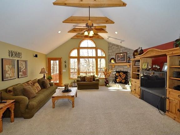 Stunning custom-built home! You'll absolutely love the gorgeous features this finished walkout basement home has to offer, including a floor-to-ceiling rock fireplace, cathedral ceilings with wood beams and a wall of windows, spacious kitchen with ample counter space , center island, and tons of cabinets (built-in desk and pull-out drawers), huge mud room, double doors lead to the oversized master with plant shelves, huge master bath, his/her closets, his/her vanities, jetted tub and walk-in shower. 2 more bedrooms on the main level with a Jack & Jill bath. Downstairs is an impressive media room with custom lighting, built-in display unit, stunning wet bar with granite tile, office/workout room, 4th bedroom, PLENTY of storage space in the large utility room with another laundry, and John Deere room with overhead door. You'll love the park-like setting with a deck overlooking the trees, patio extending the full width of the home, and the built-in basketball court! It's a must see!