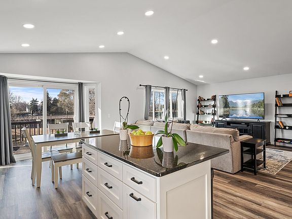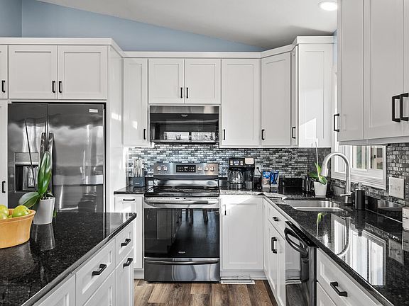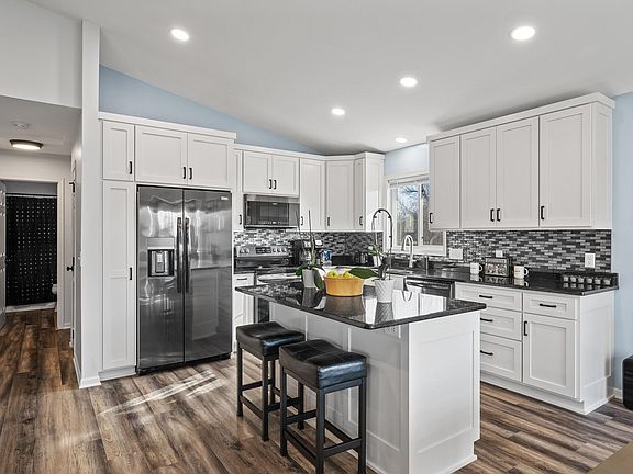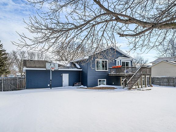 Step into this inviting split-entry home, where thoughtful design meets contemporary style. The upper level boasts an open-concept layout with a neutral palette, soaring vaulted ceilings, recessed lighting, and an abundance of natural light streaming through large windows. The standout kitchen features crisp white cabinetry paired with sleek black countertops, a stylish backsplash, black hardware, and a functional center island. The dining area opens to the deck, ideal for seamless indoor-outdoor entertaining. The upper level also includes two generous bedrooms, including a primary bedroom with convenient access to a full walk-through bathroom. Downstairs you'll discover a spacious family room, perfect for movie nights and gatherings. Two additional bedrooms and a ¾ bath provide ample space for guests or a home office. Outside, the expansive, fully fenced backyard is ideal for recreation and relaxation. Enjoy the concrete slab with a basketball hoop, offering fun for all ages and the potential for hosting outdoor activities on this spacious lot. Great location close to shopping, dining and Bunker Hills Regional Park offering trails, a golf course and seasonal activities. You will appreciate the proximity to highly rated schools like Morris Bye Elementary, Coon Rapids Middle School, and Coon Rapids Senior High. A wonderful place to call home!