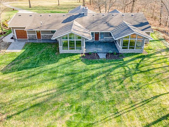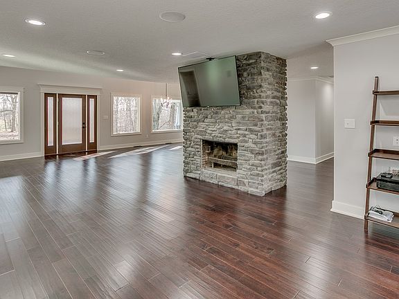 Down a long winding driveway sits the secluded & private home you've been dreaming of! This home has been brought down to the studs and then rebuilt leaving it in practically new construction condition. Sitting on a sprawling 15+ acre lot offering an abundance of privacy, this gorgeous property is peppered with mature trees just oozing curb appeal from the moment you arrive with professionally designed landscaping, a beautiful stamped concrete drive, & covered awning. Step inside to this beautifully designed home where you are immediately greeted by the sprawling open concept floor plan. Designer hardwood floors fill the space, highlighted with tons of natural light! The immaculate attention to detail given to this remodel is apparent in every inch of the design. Your eye is drawn to custom features like the two-sided floor to ceiling stone fireplace, wooden beam details, & updated fixtures implemented throughout the entire home. Step from the spacious living room and into the chef's kitchen. Built to entertain, this spectacularly designed kitchen boasts custom soft-close cabinetry, luxe granite countertops and top-of-the-line stainless-steel appliances. Bonus breakfast bar seating brings in even more space to entertain friends and family alike! The private family spaces are equally as impressive with modern bathrooms & spacious bedrooms that have plenty of closet space. The master bedroom is particularly spectacular with private patio access, tons of room to spread out, a completely custom walk-in closet and a spa-like ensuite with double vanity & an unbelievable walk-in shower with rain attachments. Two other bedrooms are on the main floor, both with patio access and one with its own en-suite. Looking for more space to bring out your inner hostess? Step down to the completely finished basement that offers limitless potential. Fitted with another floor to ceiling stone fireplace and plenty of room for a media area, craft space, office, or anything else your heart desires! The entertainment area continues outside with spectacular outdoor spaces in the front and back. Covered patios and spaces to soak in the sun give you plenty of room to enjoy the mature property views. This studs to ceilings remodel left no corner unturned. From the flooring to the trim, drywall & paint, newly poured 3 car garage, & a whole home stereo system with surround sound throughout. An excellent location with no HOA, this home is just 10 minutes from I-69 & Lutheran Hospital!