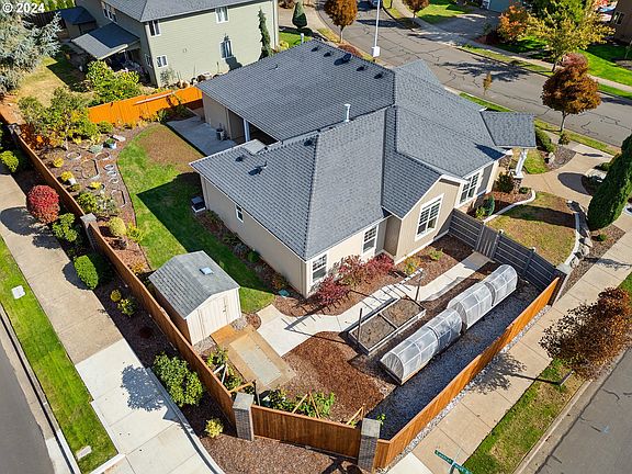 This single-level home, built in 2003, offers an inviting layout with 2,219 sqft of living space and sits on a beautifully landscaped 0.23-acre corner lot. Natural light pours in through the many windows, showcasing the oak floors and fresh paint throughout. The heart of the home is the cozy kitchen featuring a cozy eating bar, which opens to a spacious living area complete with a gas fireplace. The primary suite offers double sinks, and a lovely walk-in closet. The other two bedrooms offer plush carpet along with a recently updated guest bathroom providing extra comfort for visitors. Step outside to enjoy the covered patio, perfect for entertaining, and a meticulously maintained yard featuring a sprinkler system, root watering system, and low-maintenance landscaping. Enjoy blueberries, raspberries, apples and plums all summer long. The fenced backyard includes Trex fencing on both sides of the house, a garden shed, and plenty of privacy. No need to worry about storage as this home features a giant garage with plenty of shelving and a handy work area. With attention to detail in every corner, this home is ideal for all as it is stunning, low-maintenance, and a thoughtfully designed space. Welcome home!