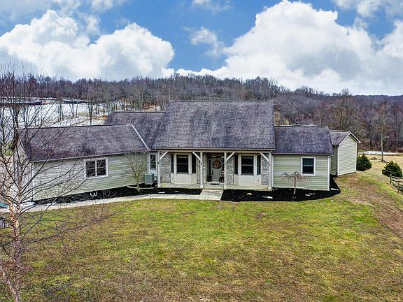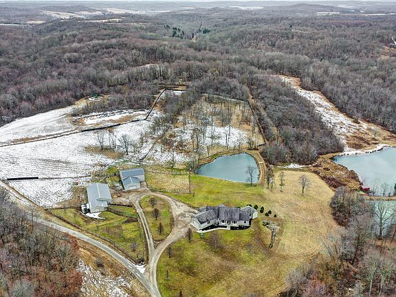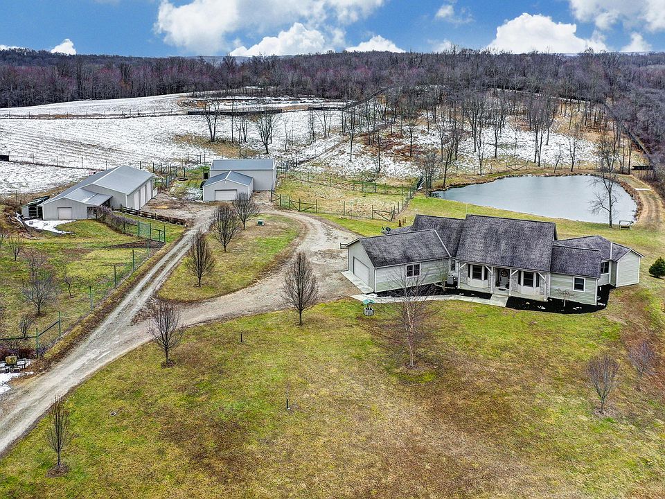 Lovely 4 bed, 3.5 bath ranch style home is situated on 21.54 acres in a beautiful and peaceful setting. This spacious country home offers several custom built-in amenities sure to wow the decerning Buyer. Peachtree wood windows, whole house wood burner, ventless remote stone fireplace. EL living area offers master suite w/ an office, a spacious eat-in kitchen, EL laundry, great room, formal dining room w/ bay windows. LL walkout, finished rec room, office space, playroom, 4th bedroom. Small Orchard, 2 car attached garage. a summer kitchen, 2 car detached garage, farm building w/pens for barn animals, chicken coop, 3 bay pole building w/ 3- 14 feet high garage doors, a stocked pond and 2 fenced in areas. Underground artesian spring. Mineral rights do not transfer w/ the sale of hom