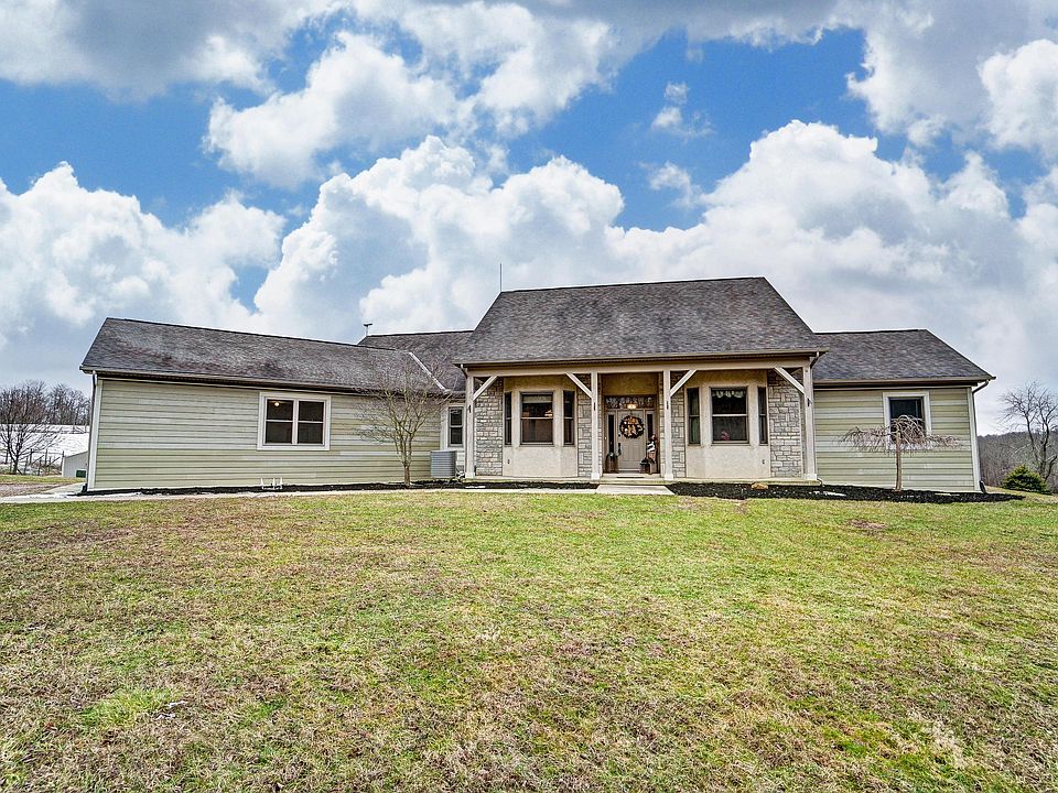 Lovely 4 bed, 3.5 bath ranch style home is situated on 21.54 acres in a beautiful and peaceful setting. This spacious country home offers several custom built-in amenities sure to wow the decerning Buyer. Peachtree wood windows, whole house wood burner, ventless remote stone fireplace. EL living area offers master suite w/ an office, a spacious eat-in kitchen, EL laundry, great room, formal dining room w/ bay windows. LL walkout, finished rec room, office space, playroom, 4th bedroom. Small Orchard, 2 car attached garage. a summer kitchen, 2 car detached garage, farm building w/pens for barn animals, chicken coop, 3 bay pole building w/ 3- 14 feet high garage doors, a stocked pond and 2 fenced in areas. Underground artesian spring. Mineral rights do not transfer w/ the sale of hom