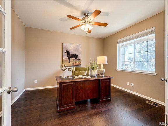 This executive style home offers very low maintenance, a 3 car attached garage, 9 foot ceilings throughout and exquisite features throughout the entire home! The Grand Entry welcomes you into this ranch floor plan featuring an office just inside. The huge kitchen features Black Cabinets, Granite Counters, Extended Cabinetry and a Large Pantry. The kitchen has a gas range, double ovens, a beautiful island and cabinetry galore! There is a formal dining room just around the corner from the kitchen, as well as an eat-in area. There is a spacious, well-appointed bath shared by the two guest rooms before you enter the Master Retreat. The master suite features a beautiful bay window overlooking the xeriscape back yard. It hosts 2 large walk-in closets and a master bath with a separate shower, tub and double sinks beautifully set in granite counters. Enjoy the stamped concrete patio in the back yard, complete with a drip system for plantings or the covered front porch. This home is sure not to disappoint even the most discriminating buyer! There is conduit already installed in the back yard for a future water feature or other power-dependent improvement. Other Inclusions: Refrigerator, 5 Burner Gas Range, Disposal, Dishwasher, Microwave, Double Ovens, Freezer in Laundry Room, Washer and Dryer, Shed at side of house, Water Softener, Liberty Safe in Basement (72x36x27.5), Workbenches and Shelving in Basement, Workbenches in Garage, Attached Shelving in Garage and Detached Shelving along walls in Garage, 2 ladders in garage mounted to ceiling, tire rack mounted in garage, 3 garage door openers (extra opener in the kitchen drawer).