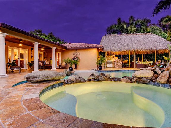 Unique, charming, TRUE 5 BR executive home in one of East Boca's most desirable communities sits on an oversized (.287) corner lot w/circular drive. A Resort Style heated salt pool & spa is surrounded by a beautifully landscaped backyard w/marble deck, custom Summer Kitchen + 350 sq.ft thatched Tiki Hut for throwing the most fabulous tropical style parties. Once inside, you'll find a beautifully maintained and decorated home featuring marble & ''wood'' floors, an open, eat-in kitchen w/white & gray wood cabinets, quartz counters, glass tile backsplash & newer(3 yrs) stainless steel appliances. Bathrooms have been updated with nice vanities,tile & seamless enclosures. LG washer & dryer. Impact French doors, accordion shutters, hurricane garage doors & generator hook-up for peace of mind.
