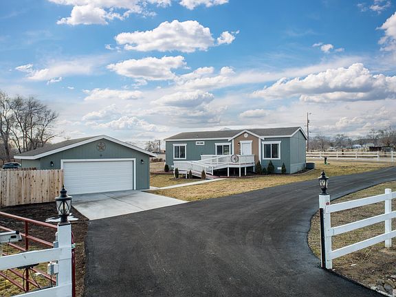 Built in 2018, this 3 bedroom 2 bath manufactured converted home is sure to impress! Beautiful wood laminate flooring in the kitchen, dining and bathrooms. Breakfast bar, large pantry, like new appliances in the kitchen. Mud room/laundry room off the back patio door with a covered deck to enjoy the gorgeous mountain views from the backyard. A nice size deck with a ramp leading up to the front door. Organized detached 2 car garage, all situated on a large flat 1 acre corner lot with horse stables, a shed, and a large fenced in area for livestock. The home has many upgrades including new asphalt so you are not bringing the mud in with you, the master bath has a newer walk in shower, a sliding glass door was installed in the dining room area to allow easy access to the covered deck in the backyard, and many more as you will see when you walk into this beautiful home.