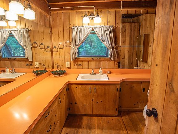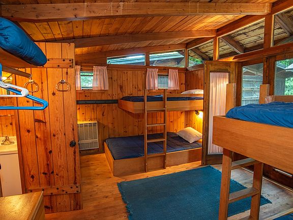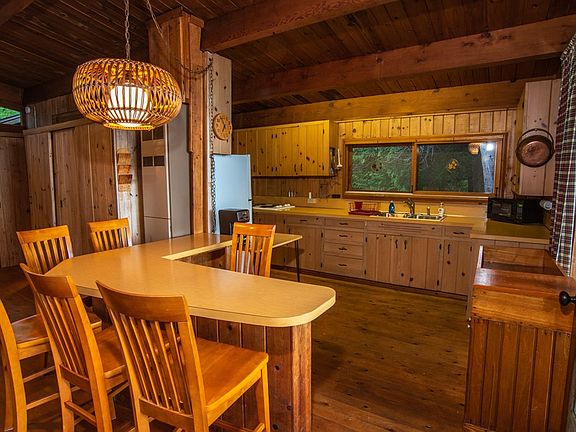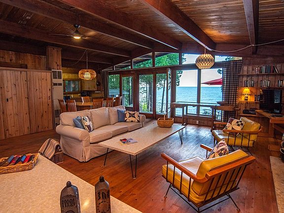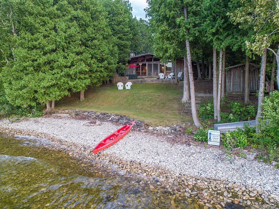 Step back in time with this absolutely charming seasonal cottage. The main, lodge building offers a spacious great room with floor to ceiling stone fireplace, vaulted, wood beamed ceilings and commanding views of the waters of Ellison Bay. There is also a large kitchen and full bath with a shower. Behind the lodge there are 2 his and hers 12 x 16 sleeping cottages each with a half bath. There is a stone patio with grill at the front of the lodge and an inground pool behind. The pool will need a new liner. This property also offers the utmost in privacy as it is at the end of a dead end road shared by only 3 other homes, property is served by Spectrum Cable high speed internet. Very secluded but just a short walk to town.