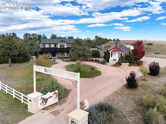 Over 125 years of love and laughter are woven into this landmark 4000 SF 6 bdrm/3 ½ bath custom home and school house on 80 acres. Built to accommodate a family of 9, this legacy ranch includes multiple barns, historic grain silo, personal picnic area and pond, irrigation cistern and endless acres to explore. More than 400 trees, planted by WPA when property was first homesteaded, now create a natural forest buffer—offering privacy, shade, and a peaceful setting for picnics and fireside gatherings near the secluded pond. The memories made here are preserved in a lovingly curated scrapbook for your perusal. The home’s interior honors its western roots, blending rustic charm with modern comforts. You’ll find a stamped tin ceiling in the kitchen, dark wood cabinetry, a river rock two-story fireplace, and arched passageways—all paying homage to the Old West. The chef's kitchen can easily cater a crowd including double dishwashers, double sinks, double ovens,extensive prep area and expansive island all with granite counters. Main floor primary suite offers a cozy 2-sided fireplace, sitting area and access to the secluded deck. Each bedroom is uniquely designed with themes reflecting the western lifestyle—dressage, rodeo, and ranching—and includes thoughtful custom touches like horse stall closet doors. Upstairs Jack and Jill bath has 4 sinks and two tub/showers. The other hall bath has two sinks and separate tub/shower area for efficient shared use. The 600 SF school house with its own bath and drinking fountain offers potential as a guest cottage or second dwelling unit. Several concrete block barns originally used for a dairy operation remain with new 2023 roofs, storage rooms, grain loft, tack rooms and several run in sheds for livestock. The large grain silo is a regional landmark and is in excellent condition. The property is completely fenced and cross fenced. There is a new 75-gal water heater, new 2023 roofs (all outbuildings), and fresh exterior paint.
