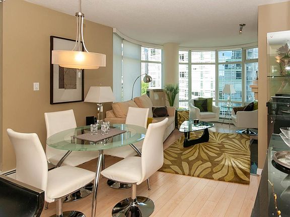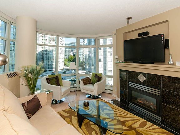 AVAILABLE UNTIL APRIL 30th, 2026 Beautifully FURNISHED 1-bdrm & den, 1-bath suite at Aquarius One on Yaletown's sought-after waterfront. The circular living room wrapped in floor-to-ceiling glass offers city & courtyard views, gas f/p & h/w floors throughout. The modern kitchen features granite counters, s/s appliances & gas cooktop. The bdrm provides a peaceful retreat, while the den/solarium is ideal for a home office. Enjoy resort-style amenities incl. gym, indoor pool, hot tub, sauna, concierge & landscaped courtyard. Steps to seawall, marina, Urban Fare & Yaletown's best shops & cafes. Rental includes: Heat, hot water, gas, electricity, internet, and 1 secured underground parking stall. No Pets.