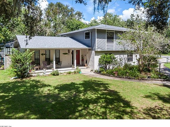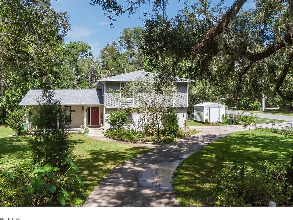 Great family home on .5 acre with an in-ground pool & no HOA in St. Johns County! Long circular drive plus separate driveway to the garage, and a very private corner lot with beautiful trees and a lovely front porch. Home features a large dining room, eat in kitchen with double french doors that lead out to the covered back porch and huge screened pool. Separate family room has a wood burning fireplace with brick front, crown molding and tons of room for a family to gather and relax. Sliders lead from this room to the Florida room which boasts ceiling fans, vinyl windows and a view of the backyard and pool. All 4 bedrooms are upstairs, the master featuring a large walk in closet and private bathroom. Hall bath has been upgraded with custom cabinet, granite counter & upgraded tile.Secondary bedrooms are roomy, laminate flooring on the stairs and throughout the second floor and downstairs family room. Tile on the rest of the first floor. 2 car garage is oversized, A/C is water to air and is hooked to the irrigation system so waters the lawn - all 4 zones. Sparkling 40 gallon in ground pool is 4' deep in the shallow end and 9' in the deep, is fully screened and has a small pool house which is great for storage. There is also a separate utility shed which sits on a concrete slab and has electric service. Property is fully fenced, and just waiting for a new family!!