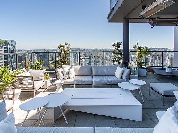 Terrace Sky Home at Brava. Remarkable views of the mountains, cityscape & False Creek can be appreciated from all vantage points of this unique residence. An expansive 1,310sf of open-plan interior & boasting a generous outdoor living area of 555sf with affixed heaters, irrigated landscaping & panoramic views. A home to easily entertain with a combined 1,865 sf of interior & exterior. Originally a two-bedroom residence which can be converted back if desired. Abundant natural light with multiple exp. The location is in the heart of downtown, w/ Emery Barnes park at your doorstep & Yaletown's cafes, restaurants, boutique shopping & recreation. Amenity rich building w/ numerous improvements, 2 side x side pkg. stalls & sto. locker. The availability of homes of this nature is rarely available.