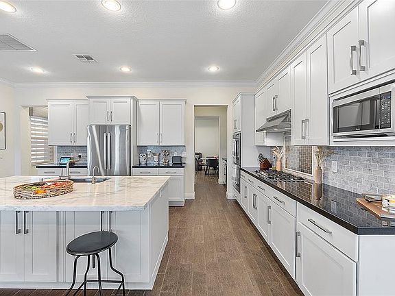 Gorgeous, updated, 5 Bed, 4.5 Bath, waterfront pool home in Heron Bay's Sawgrass neighborhood. Gormet chef's Kitchen w/Quartz Counters, Huge Island, Double Wall Ovens, Butler's Pantry & Gas Range. Family Room overlooks screened patio w/built-In summer kitchen & wood ceilings. Living Room w/ soaring ceilings and windows w/custom window treatments. Large primary bedroom features a huge designer closet w/ built-ins, bathroom w/ big shower & separate tub. All bedroom closets have built-ins. 1 bedroom en-suite & the other 2 feature a Jack & Jill bathroom. Oversized patio w/ heated pool & spa. Pool filter housing ('23). Irrigated dog run and mosquito control system. Downstairs bedroom w/ cabana bath, built-in cabinets and desk. Garages w/ epoxy floors, overhead storage ('23) & EV charger.